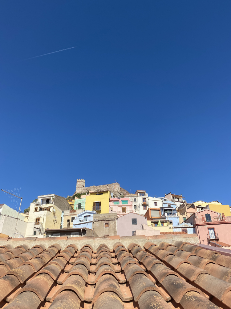 Percorrendo la strada 129 bis, una delle più famose strade di Sardegna, si rivelano allo sguardo i colori delle casette colorate che adornano il Serravalle, un colle sul quale è visibile il castello dei Malaspina.