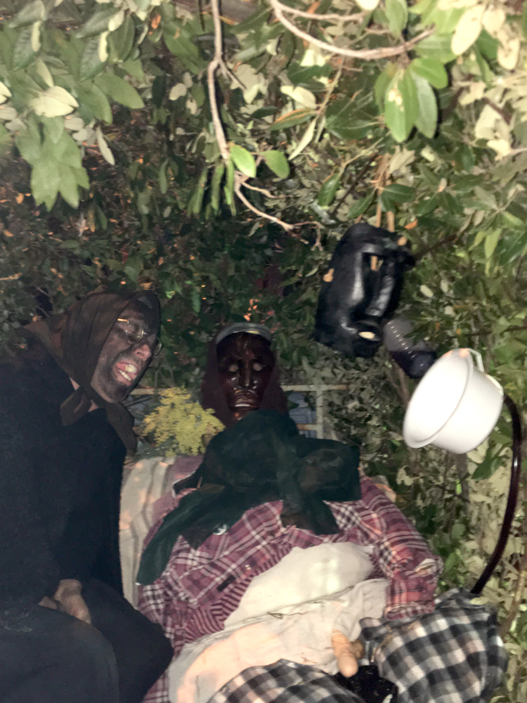Orotelli: Sfilano Sos Thurpos (i ciechi), vestiti di nero orbace e con il viso annerito dalla fuliggine ; accanto a loro compaiono personaggi come S’Eritaju.